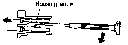 3. Insert the tip of the screwdriver [1.4 mm (.06 in.) width] into the connector as shown in the figure, raise the housing lance slightly with it, and pull out the harness.
