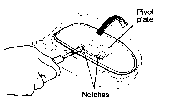 Tilt the mirror upward and fit a screwdriver blade covered with protective tape in the notch between the mirror and the pivot plate to pry up the mirror.