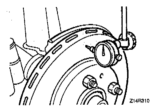 3. Place a dial gauge approximately 5 mm (0.2 inch) from the outer circumference of the brake disc, and measure the run-out of the disc.