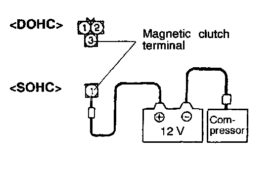 1. Connect magnetic clutch terminal at the compressor side to the positive (+) terminal of the battery, and ground the negative (-) terminal of the battery to the compressor.