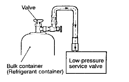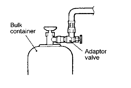 CAUTION: If the bulk container is inverted, liquid refrigerant may be drawn into the compressor damaging it by hydraulic lock. Keep the bulk container upright to ensure that refrigerant is charged in gas state.