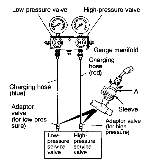 NOTE: The high-pressure service valve is on high-pressure pipe B, and the low-pressure service valve is on the low-pressure hose.