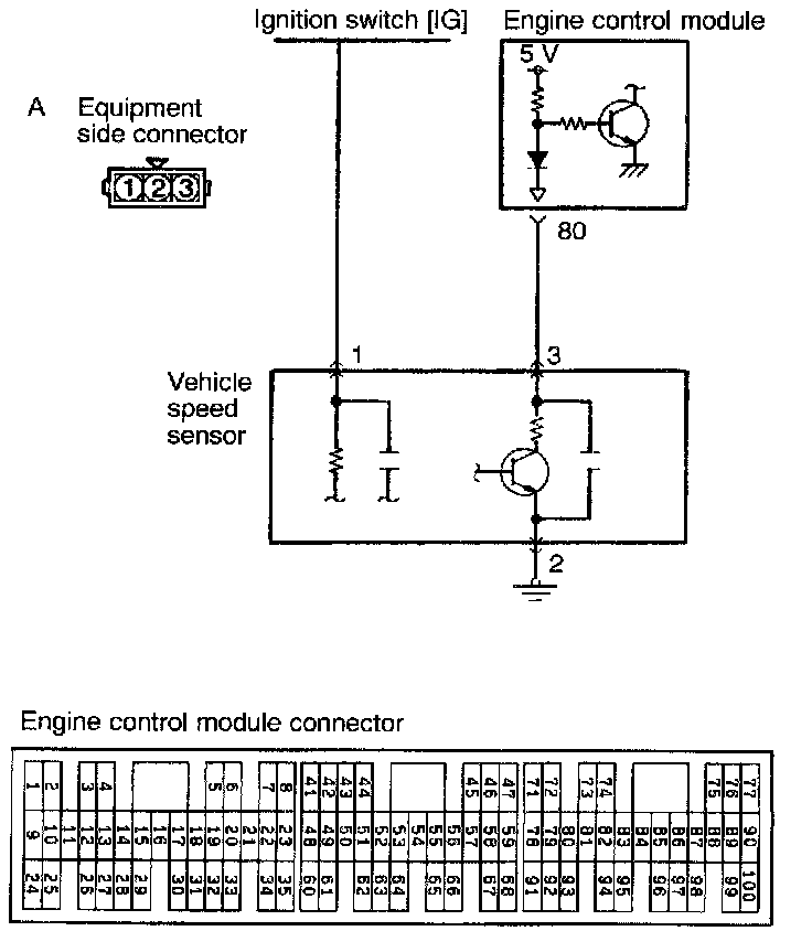 - The output terminal of the vehicle speed sensor has a voltage of approx. 5 V applied from the control module. The vehicle speed sensor generates pulse signals by turning on and off the power transistor.
