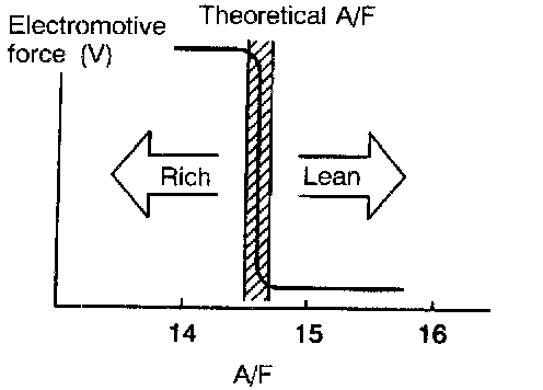 - The heated oxygen sensor outputs about 1 V when the air-fuel ratio is richer than the theoretical ratio and outputs about 0 V when the ratio is leaner (higher oxygen concentration in exhaust gas).