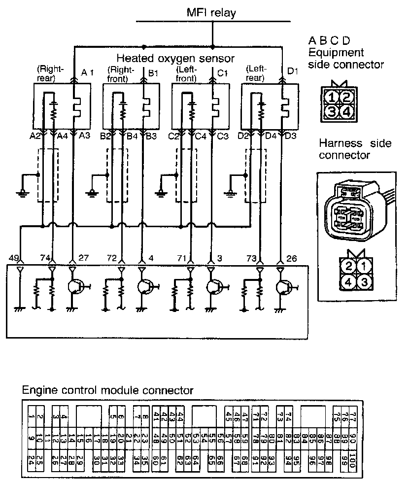 - The battery voltage is supplied to the heated oxygen sensor through the MFI relay. Therefore, the sensor element is heated by the heater so that the heated oxygen sensor remains responsive even when the exhaust temperature is low.