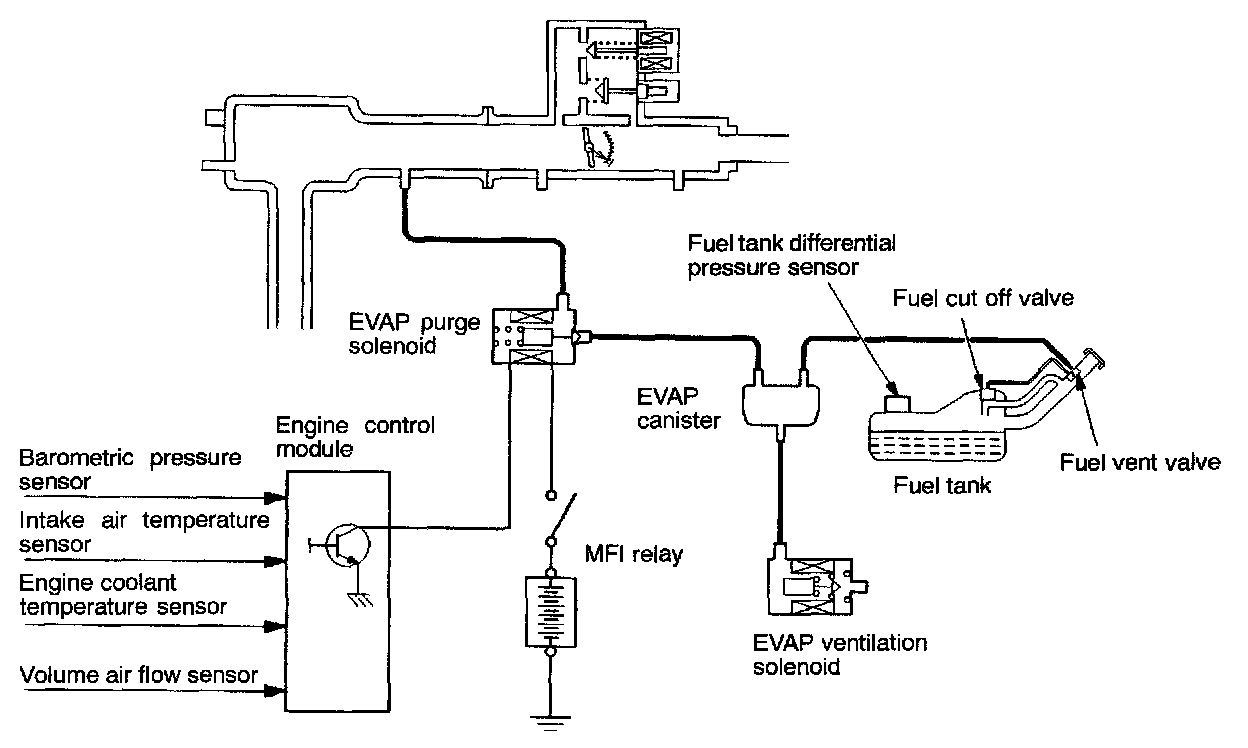When the engine coolant temperature is low or when the intake air quantity is small (when the engine is at idle for example), the engine control module brings the EVAP purge solenoid into the OFF state to shut off the fuel vapor flow to the intake manifold plenum. This does not only insure the driveability when the engine is cold or running under low load but also stabilize the emission level. Furthermore, an EVAP ventilation solenoid is located between the EVAP canister and the atmosphere in order to carry out OBD-II EVAP leak monitoring.