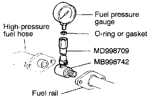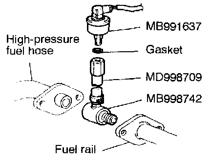 2. Place a suitable O-ring or gasket on the assembled special tools MD998709 and MD998742 and install the fuel pressure gauge.