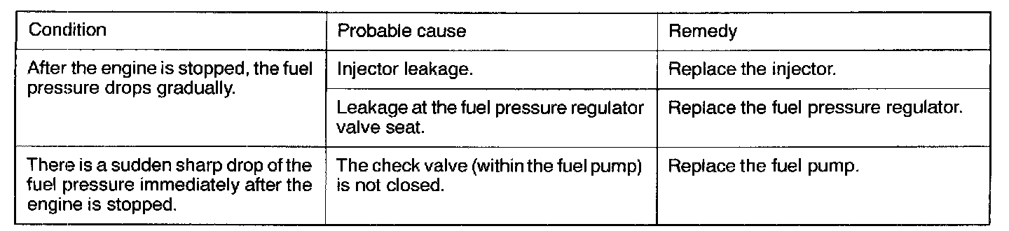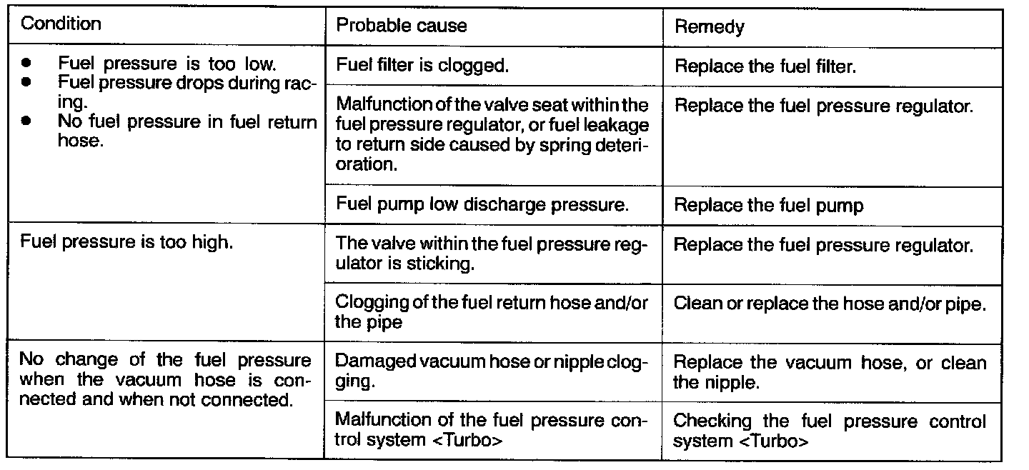 13. If the fuel pressure measured in steps (9) to (12) deviates from the standard value range, check for the probable cause by referring to the table below, and then make the appropriate repair.