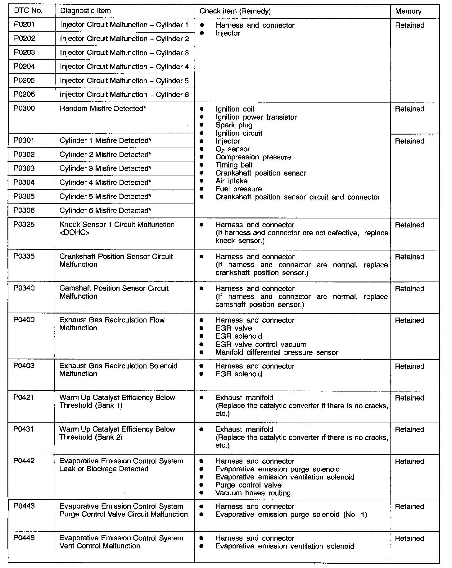 2. After the ECM detects a malfunction a diagnostic trouble code is recorded when the engine is next started and the same malfunction is re-detected. However for items marked with a "*" the diagnostic trouble code is recorded on the first detection of the malfunction.