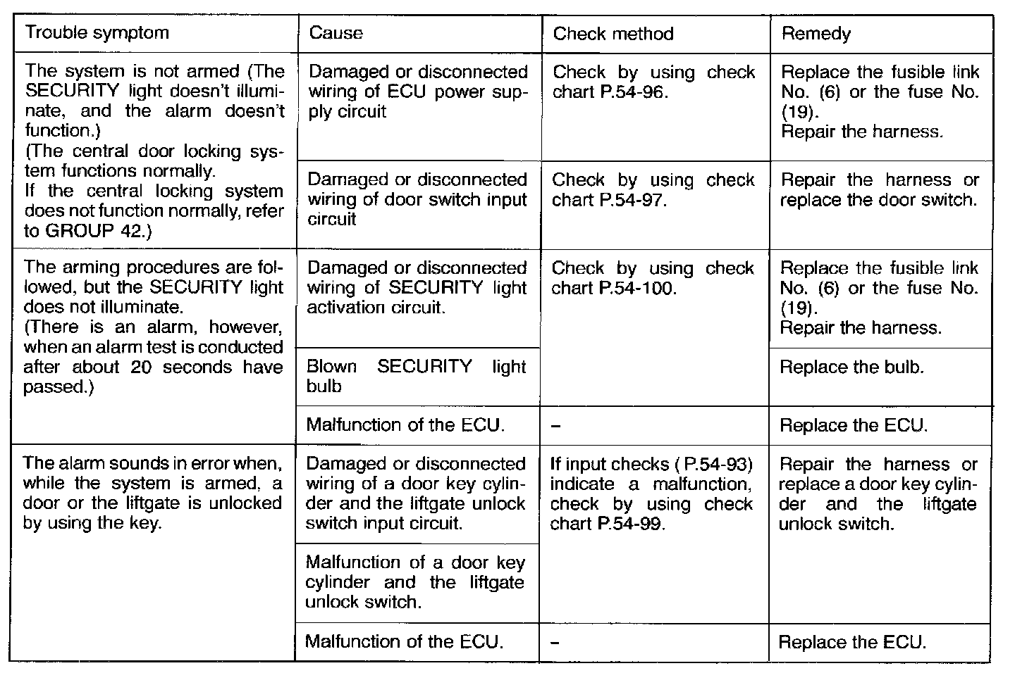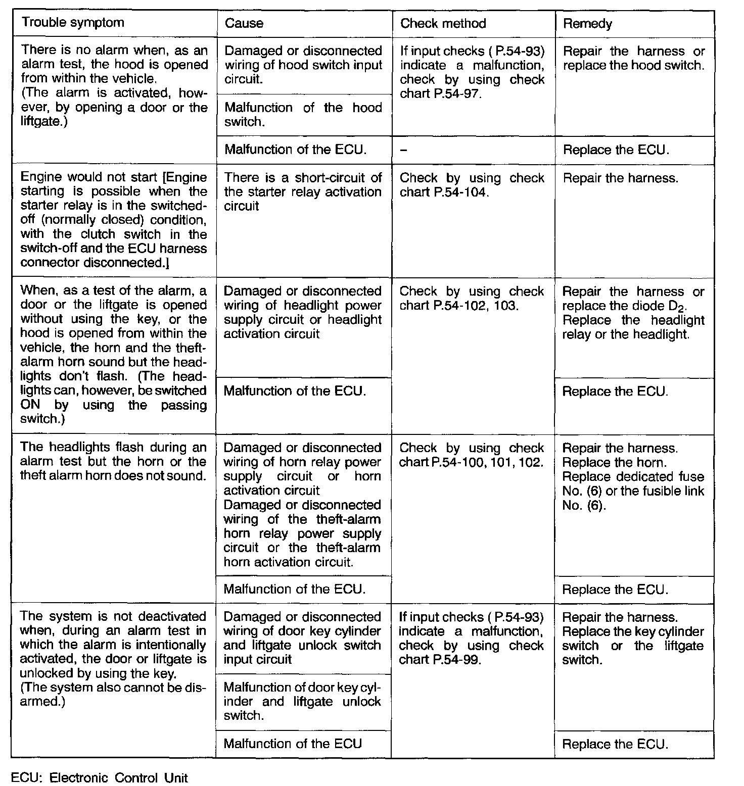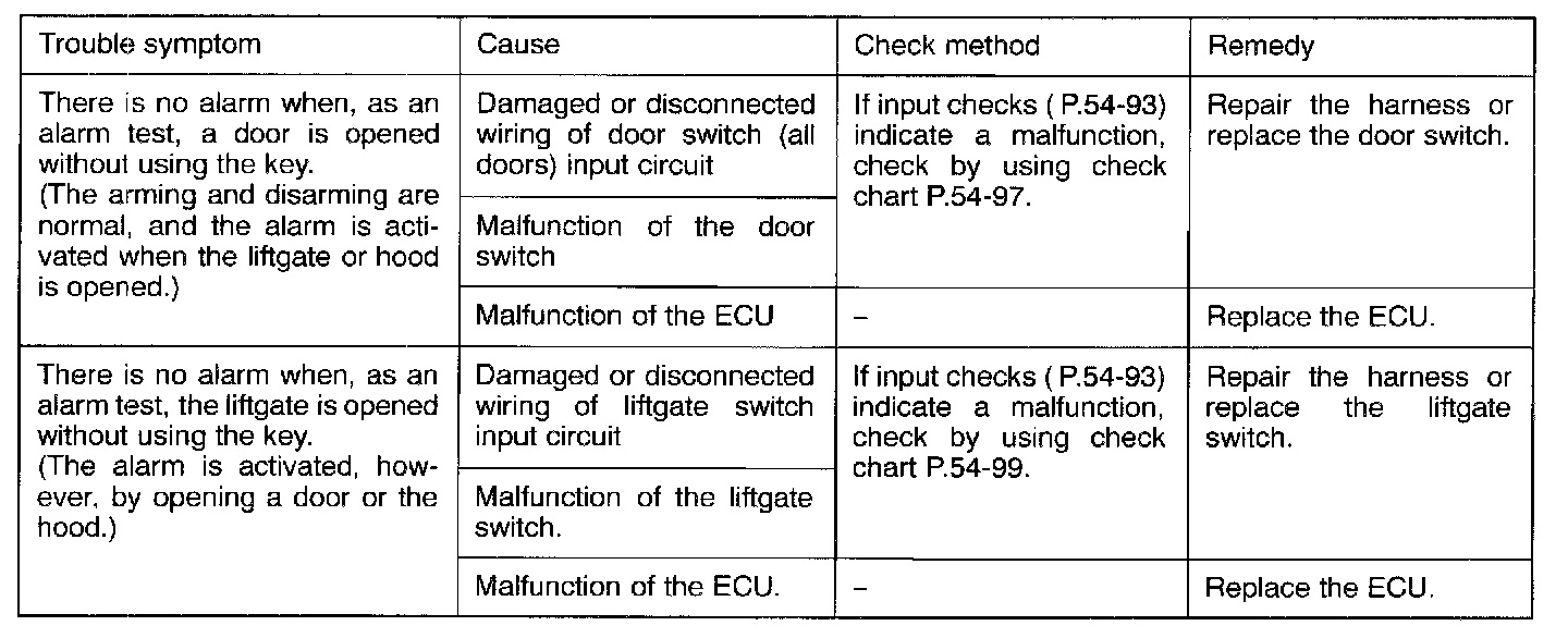 1. If the liftgate unlock switch or door key cylinder unlock switch is operated roughly, or if these switches have been installed incorrectly or switches themselves are defective the ECU may not accept the warning or alarm cancelling signal. In such case, the alarm operation will take place when the door is opened using a key. [When the door key cylinder switch has been shorted, however, if the ignition switch is turned ON, the ECU judges the detection switch as faulty and thereafter, it will prevent setting of (warning) alarm until the shorting is corrected.]