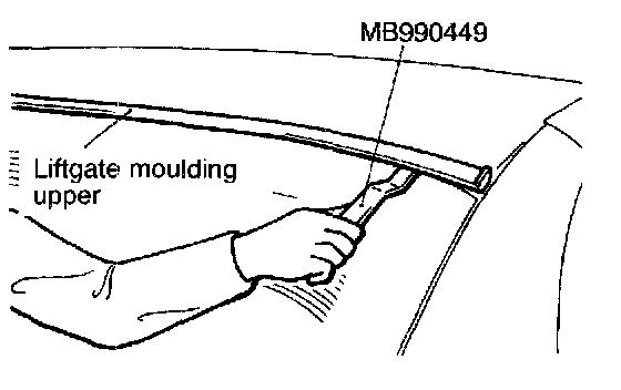 Using the special tool, pry up the clipped portions to remove the liftgate moulding upper and lower.