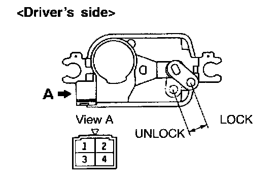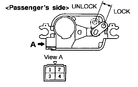 2. Then place the rod in the UNLOCK position, apply the battery power to the terminal [(1) for driver's side or (3) for passenger's side], and check to see that when the terminal [(3) for driver's side or (1) for passenger's side] is grounded, the rod moves to the LOCK position.
