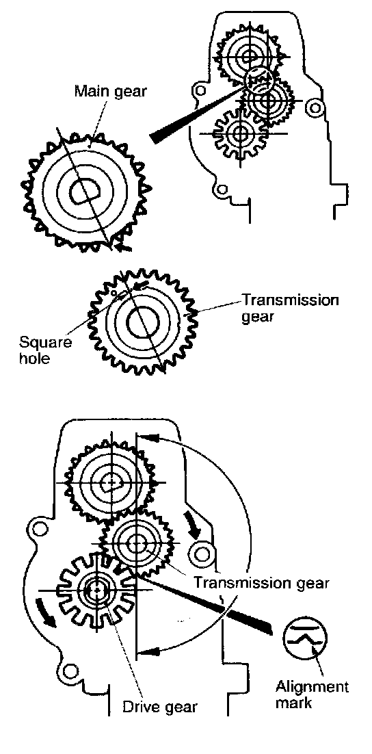 2. Align the main gear tooth with the square hole in the transmission gear as shown in the illustration.