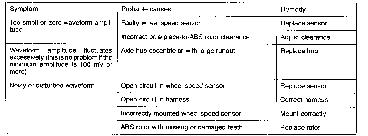 NOTE: The wheel speed sensor cable moves following motion of the front or rear suspension. Therefore, it is likely that it has an open circuit only when driving on rough roads and it functions normally on ordinary roads. It is, therefore, recommended to observe sensor output voltage waveform also under special conditions, such as rough road driving.