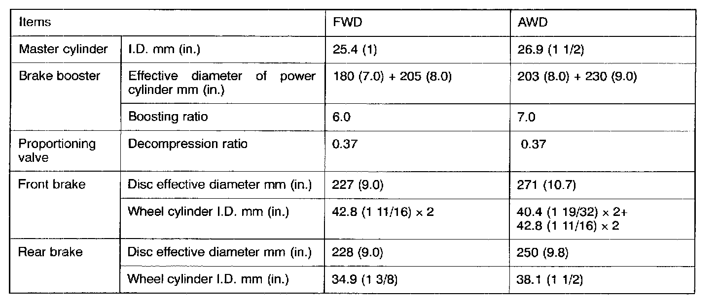 - For stable braking force and to improve the braking feeling, a pin slide type 2-piston (M-R57W) is used on FWD models and an opposed tandem 4-piston (M-R76Z) front ventilated disc brake is used on AWD models.