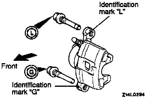 Install the guide pin and lock pin mating the head markings on the guide and lock pins with the identification markings on the caliper body.