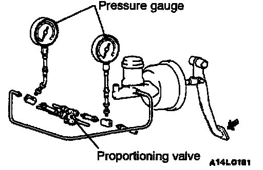 PROPORTIONING VALVE FUNCTION TEST1. Connect two pressure gauges, one each to the input side and output side of the proportioning valve, as shown.