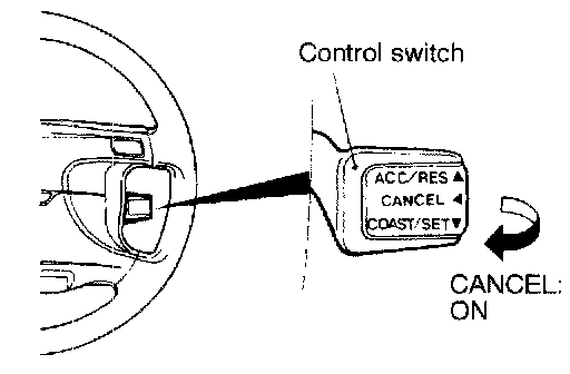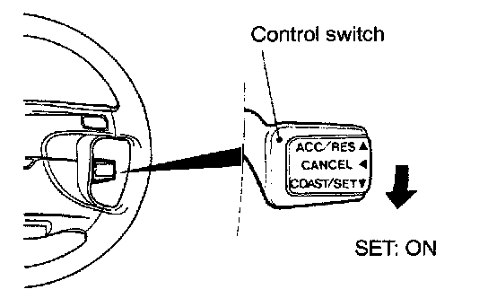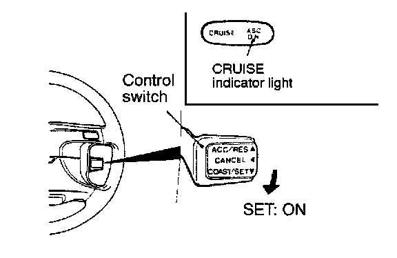 4. Check to be sure that the speed is the desired constant speed when the switch is released, and also check to be sure that the CRUISE indicator light (within the combination meter) illuminates.