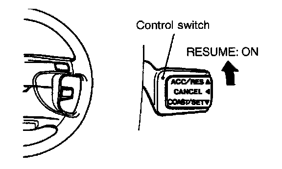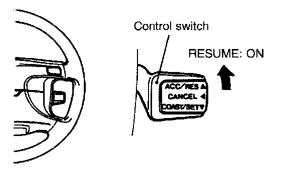 3. With the vehicle at a speed of more than about 40 kph (25 mph), check that when the control switch is moved upward (RESUME switch: ON), the vehicle resumes cruising at the speed held before cancellation of the cruise control mode.