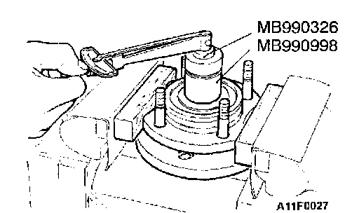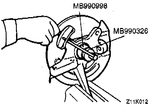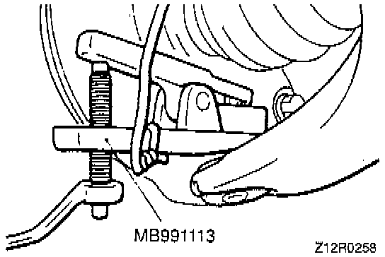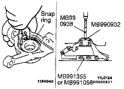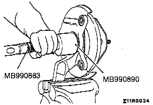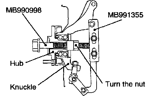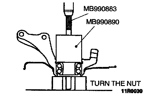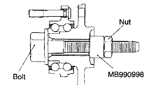 CAUTION: Do not apply vehicle load to the wheel bearing loosing the drive shaft nut. If, however, vehicle load must be applied to the bearing in moving the vehicle, temporarily secure the wheel bearing by using the special tools, M B990998, etc.