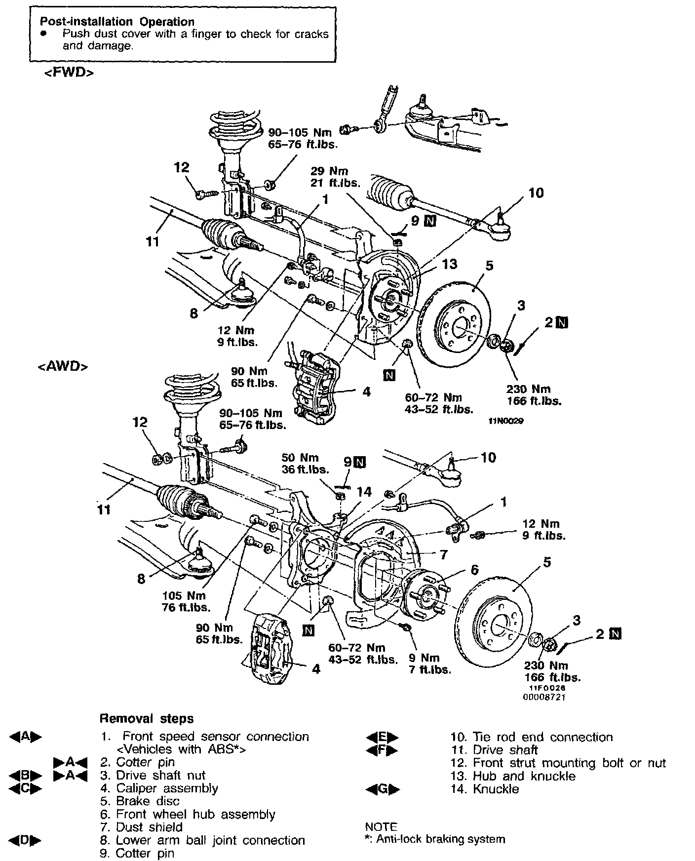 In the case of AWD-vehicles with ABS, take care not to damage the rotor for ABS installed to the B.J. outer race when removing the knuckle.