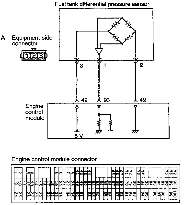 - 5 V of power is supplied to the fuel tank differential pressure sensor from the engine control module, and the sensor circuit ground is located in the engine control module.