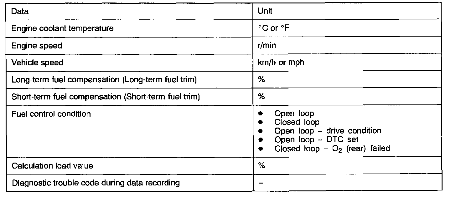 This data can be read by using the scan tool, and can then be used in simulation tests for troubleshooting. Data items are as follows.