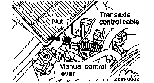2. Loosen transaxle control cable to manual control coupling adjusting nut to set cable and lever free.