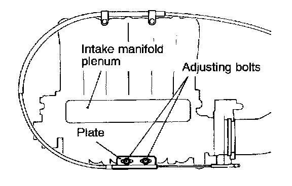 4. If the play is out of the standard limits, loosen the adjusting bolts, slide the plate so that the inner cable play will fall within the standard limits, and then retighten the adjusting bolts.