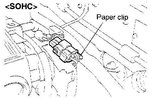1. Install a paper clip to the 3-pin connector from the harness side as shown in the illustration. Do not disconnect the connector.