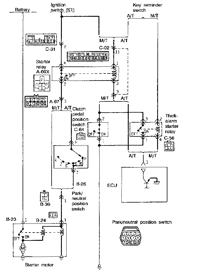 The ECU transistor is turned ON if the vehicle door etc. are opened without use of the key. This turns OFF the starter relay and power ceases to be supplied to the starter magnet switch.