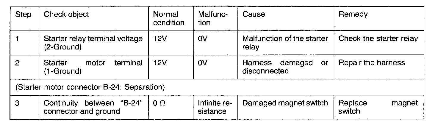 Checking the starter relay activation circuit (Disconnect the connector of the ECU, depress fully the clutch pedal and activate the starter relay)