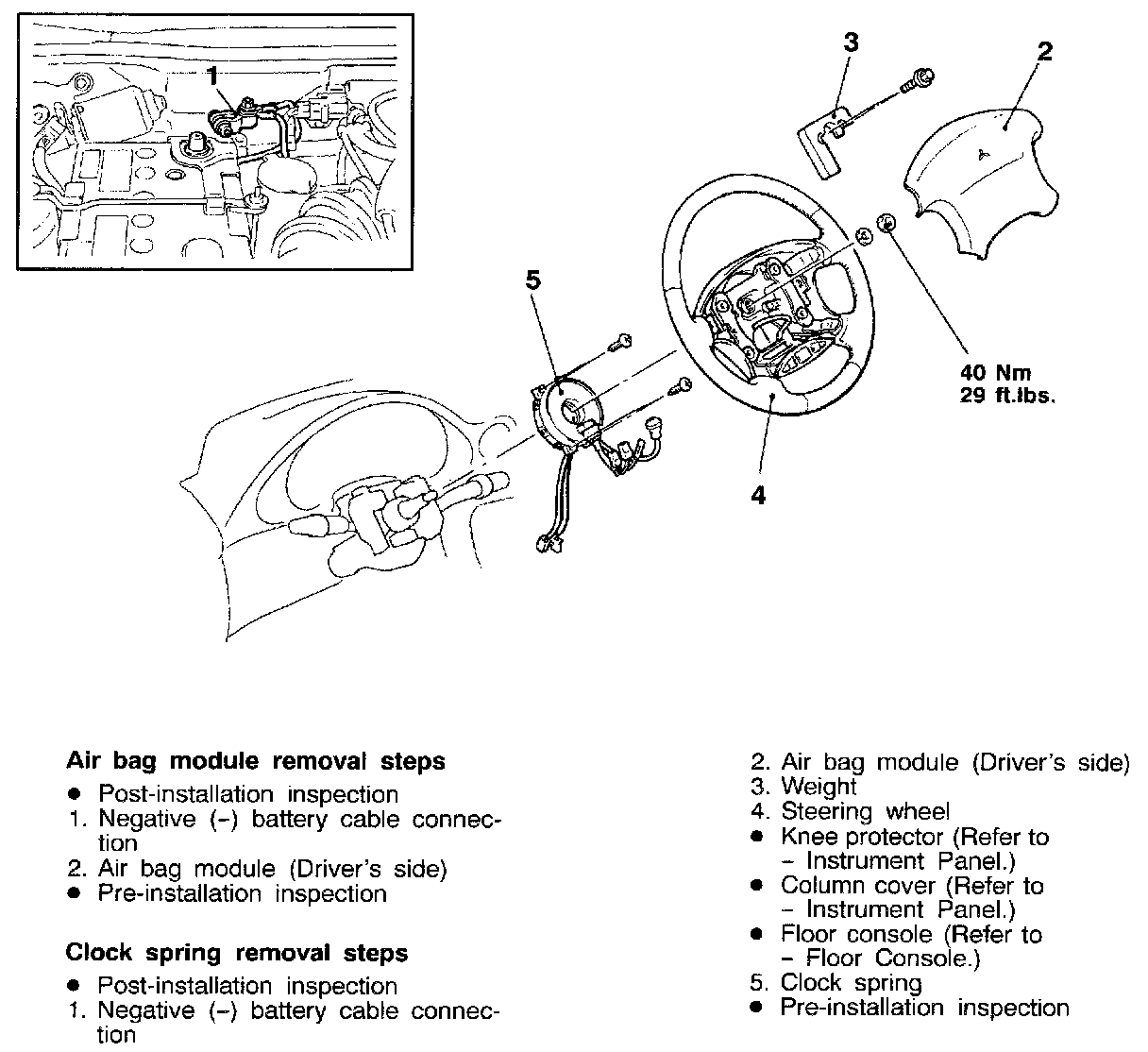 5. Turn the ignition key to the "LOCK" position, disconnect the negative battery cable and tape the terminal to prevent accidental connection and air bags deployment.