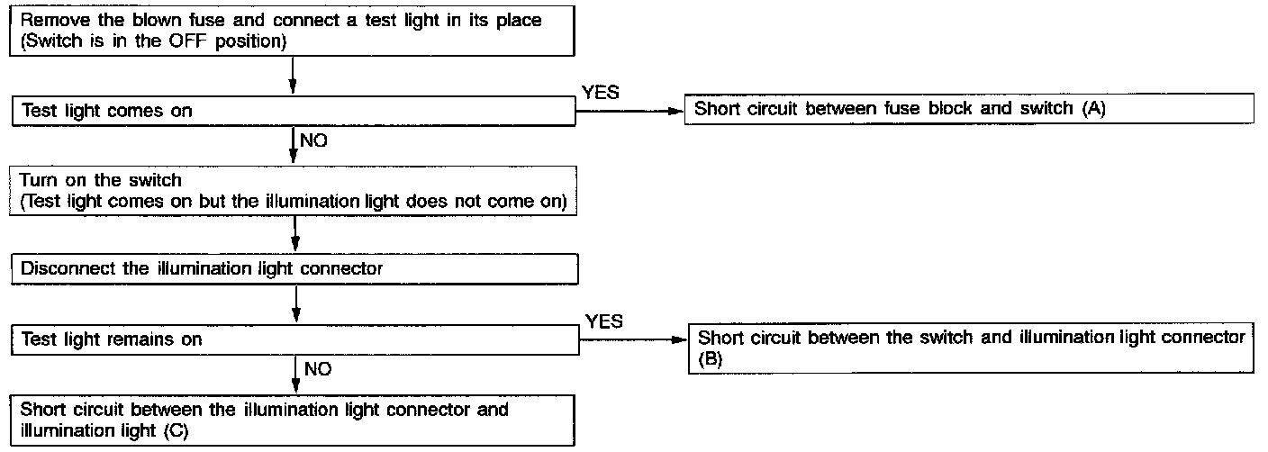 A blown fuse indicates that a circuit is shorted. The circuit responsible can be determined by the following procedures.