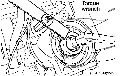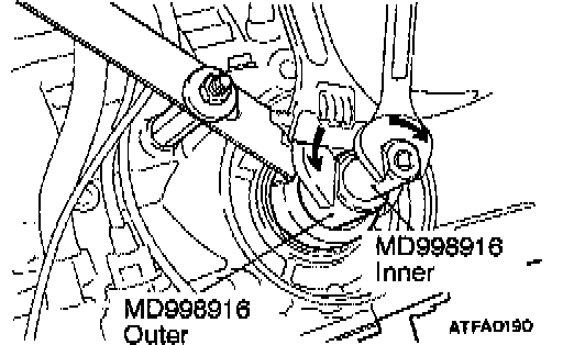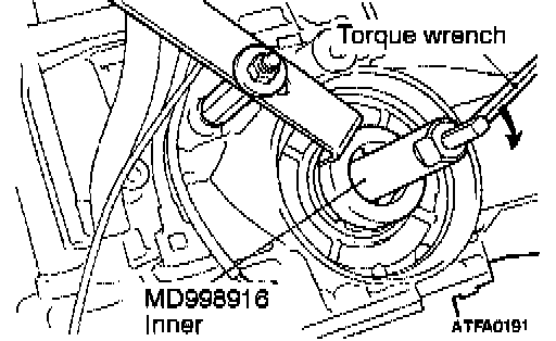 7. Attach a torque wrench to the special tool (inner) and tighten to a torque of 10 Nm (7.2 ft. lbs.) and repeating "Tighten" and "Loosen" two times then torque to 5 Nm (3.6 ft. lbs.). After that, back off the special tool (inner) 2 to 2-1/4 turns.