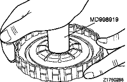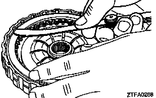 1. Check clearance between the snap ring and clutch reaction plate. To check the clearance, hold entire inside diameter of the clutch reaction plate down with 50 N (11 lbs.) force. If clearance is out of standard value, select a snap ring to obtain the standard value.