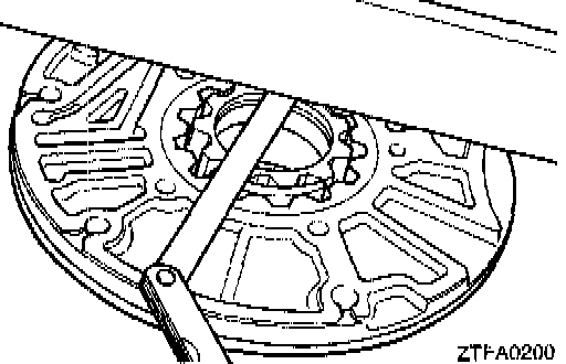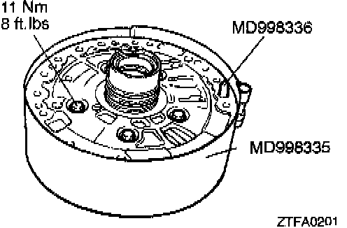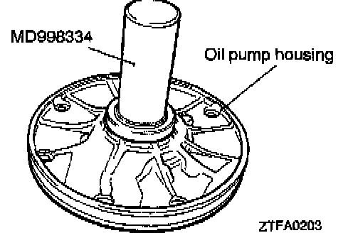 2. Insert the special tool, Guide Pin MD998336, in the oil pump bolt hole and tighten the peripheries of the support and housing with the special tool, Band MD998335, to locate the support and housing.