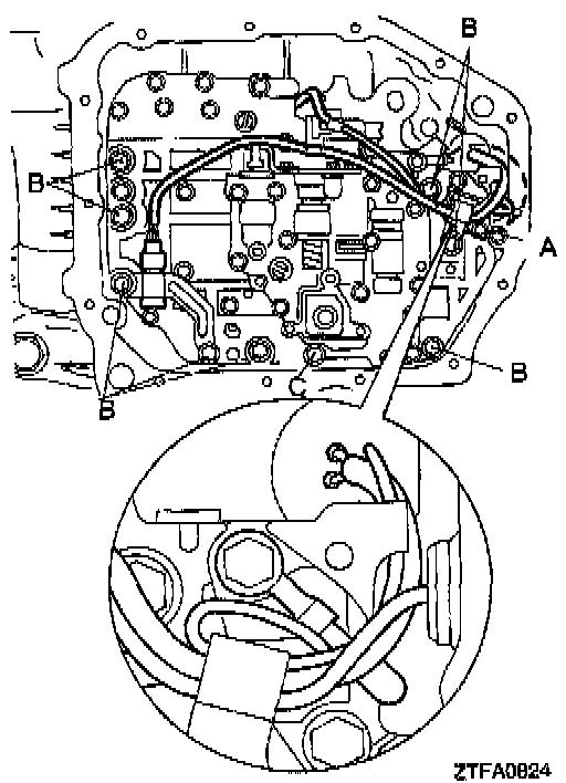 CAUTION: Firmly fasten the solenoid valve and oil temperature sensor harness at the position shown in the diagram. Especially, be sure to route the Pressure Control Solenoid Valve (PCSV) harness, which is separated from other harness, as shown in the diagram and fasten the harness with a clamp, Failure to fasten it may result in contact with the detent plate or parking rod.