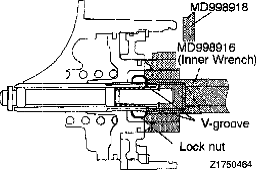 b. Loosen the lock nut until it is about to reach the V-groove in the adjusting rod. Tighten the special tool (inner) until it touches the lock nut.