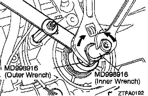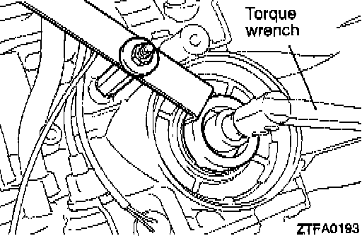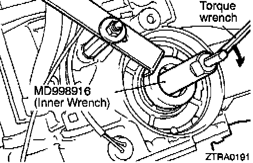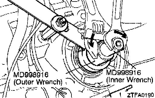 d. Fit torque wrench to the special tool (inner) to tighten it to a torque of 10 Nm (72 ft. lbs.) and loosen. Repeat this sequence two times before tightening the special tool (inner) to 5 Nm (36 ft. lbs.) torque. Then back off the special tool (outer) 2 to 24/4 turns.