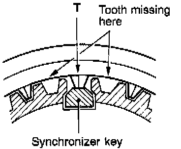 2. The synchronizer sleeve has tooth missing at six portions. Assemble the hub to the sleeve in such a way that the center tooth "T" between two missing teeth will touch the synchronizer key.