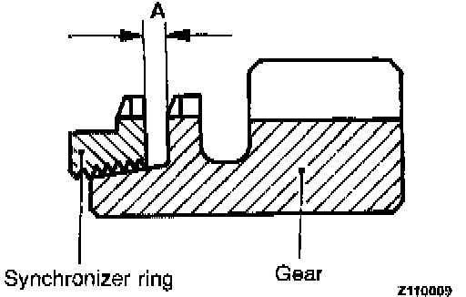 3. Force the synchronizer ring toward the clutch gear and check clearance "A". Replace if it is out of specification.