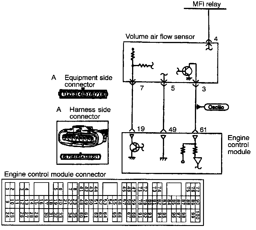 - The volume air flow sensor power is supplied from the MFI relay to the volume air flow sensor and is grounded in the engine control module. The volume air flow sensor generates a pulse signal as it repeatedly opens and closes between the 5 V voltage supplied from the engine control module and ground.