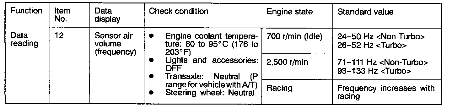 If the engine can be run idle even though the volume air flow sensor output frequency is out of specification, troubles are often found in other than the volume air flow sensor itself.