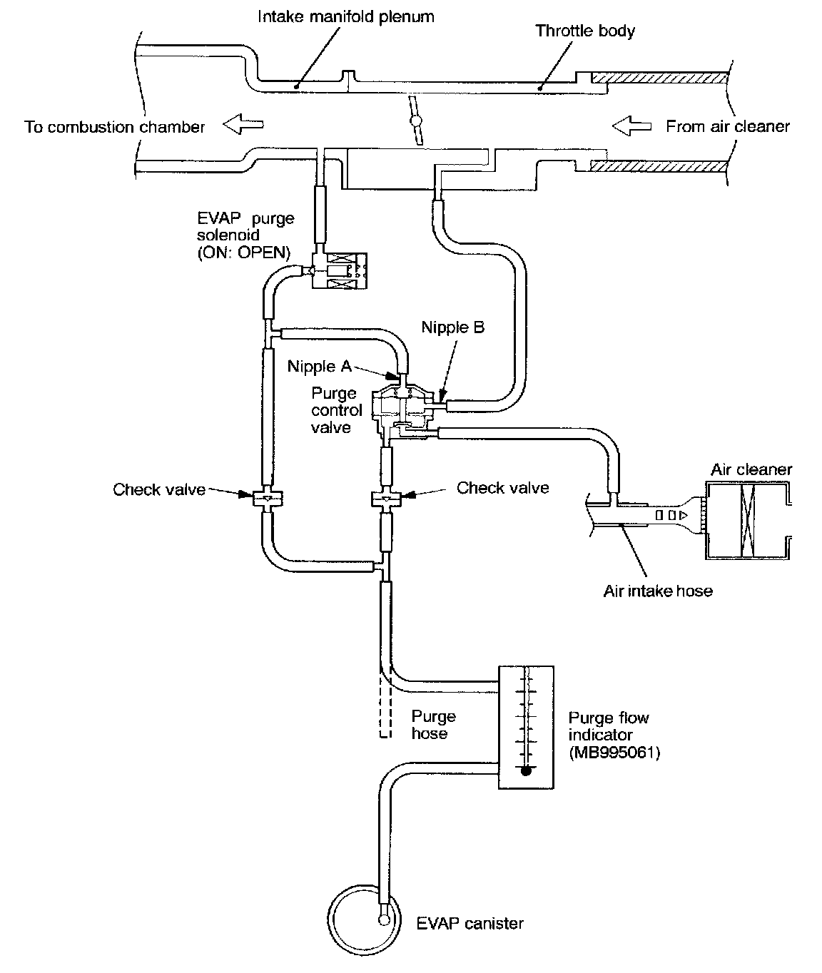 1. Disconnect the purge hose from the evaporative emission (EVAP) canister and connect the special tool (purge flow indicator) between the purge hose and the EVAP canister.