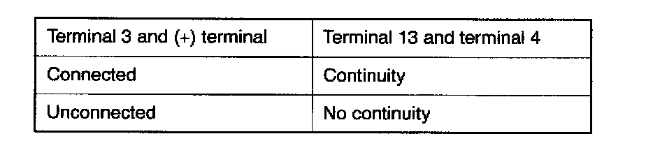 1. Connect the negative (-) terminal of the 1.5 V power supply to terminal (4) of the ignition power transistor; then check whether there is continuity between terminal (13) and terminal (4) when terminal (3) and the positive (+) terminal are connected and disconnected.