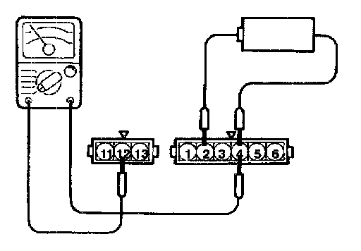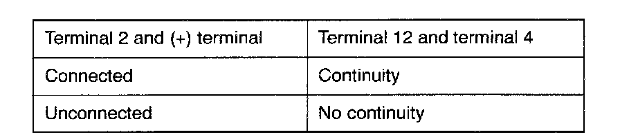 1. Connect the negative (-) terminal of the 1.5 V power supply to terminal (4) of the ignition power transistor; then check whether there is continuity between terminal (12) and terminal (4) when terminal (2) and the positive (+) terminal are connected and disconnected.