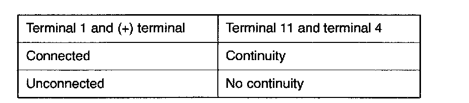 1. Connect the negative (-) terminal of the 1.5 V power supply to terminal (4) of the ignition power transistor; then check whether there is continuity between terminal (11) and terminal (4) when terminal (1) and the positive (+) terminal are connected and disconnected.