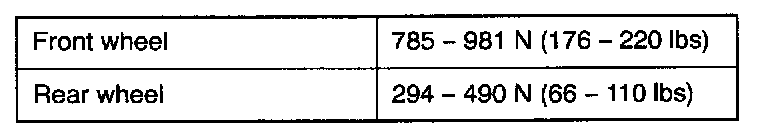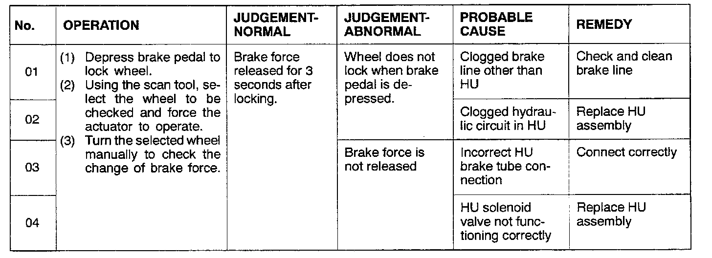 6. Turn the wheel by hand and check the change in braking force when the brake pedal is depressed. When using the braking force tester, depress the brake pedal until the braking force is at the values shown in the provided table, and check to be sure that the braking force changes to the brake drag force inspected in step 2 when the actuator is force-driven.