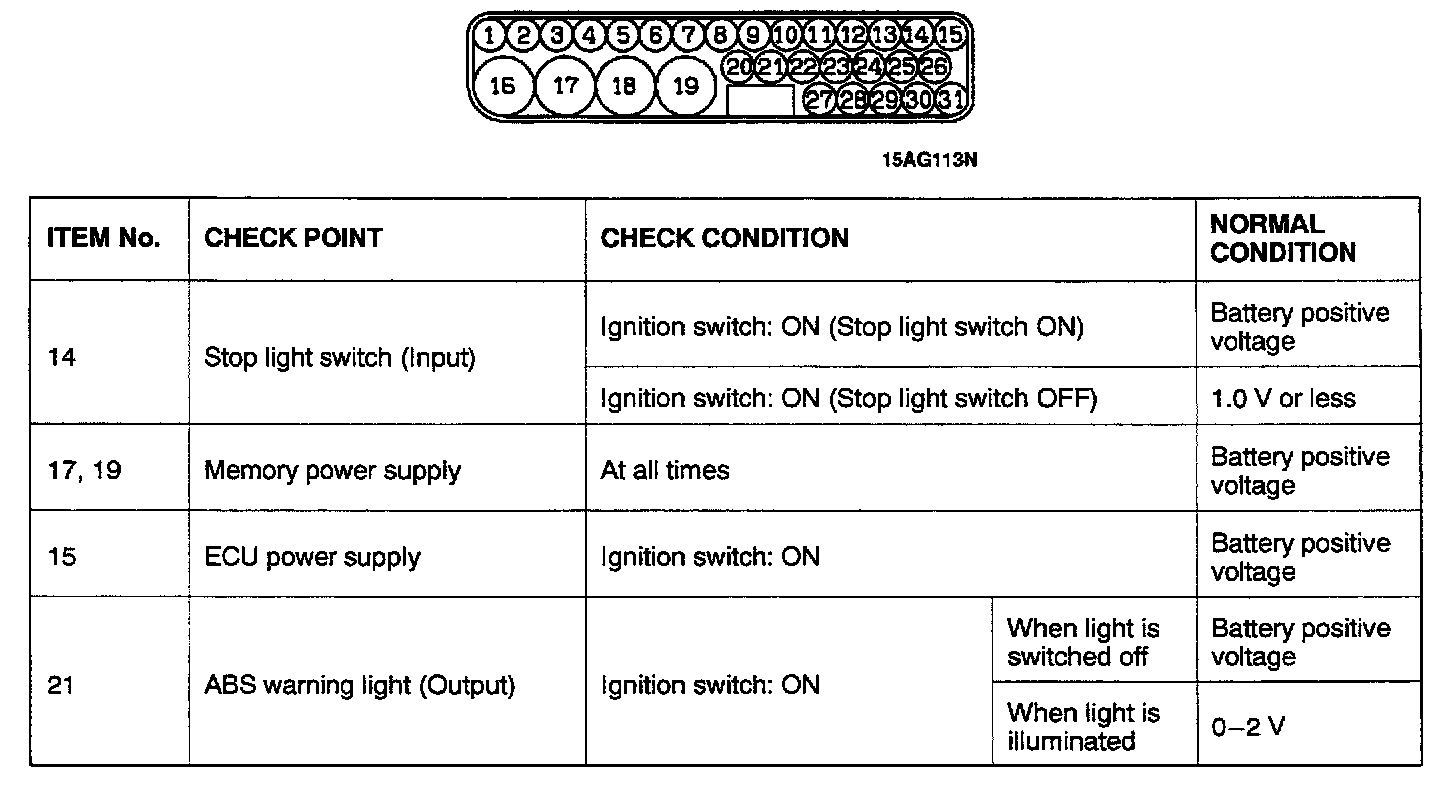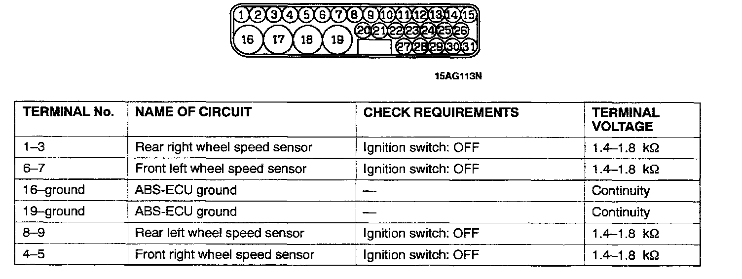 Caution: If resistance or continuity checks are performed on the wrong terminals, damage to the vehicle wiring, sensors, ABS-ECU, and/or ohmmeter may occur. Use care to prevent this!